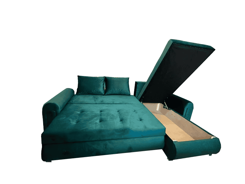 Berlin L- Shaped 3-Seater Green Velvet Corner Sofa Bed with compact Storage & Pull-Out Bed – UK