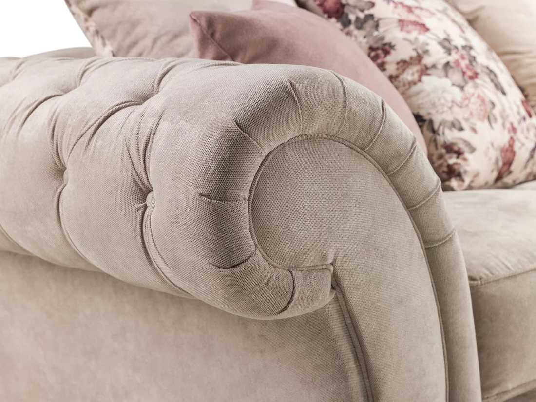 Upholstered in soft beige polyester fabric, the Roma Chesterfield corner sofa creates a light and airy atmosphere that complements a wide range of decor styles. The rounded button-tufted scroll arms add elegance while the clean lines ensure the design remains contemporary and versatile.